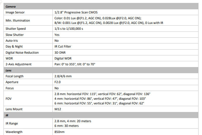 - Color: 0.01 Lux @(F1.2, AGC ON),0.028Lux @(F2.0, AGC ON);